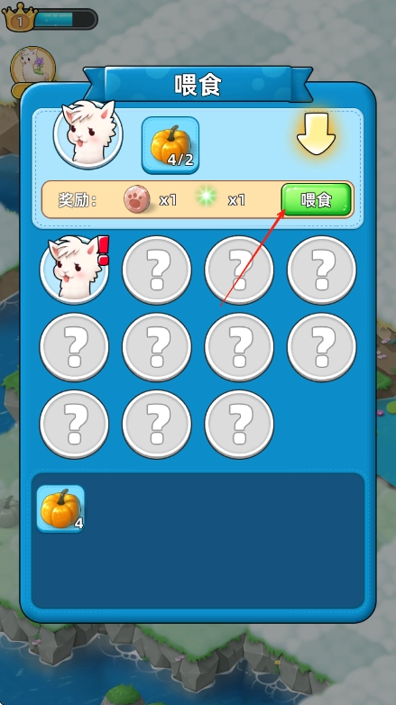 2、打开喂食界面,查看所需喂食材料数量,如南瓜4/2,点击喂食按钮尝试喂食。
