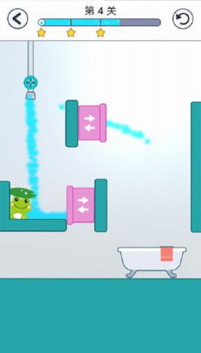 点击“开始”,滑动手指,依据观察水管落水点做出针对性调整。头顶正上方蓝色的水柱标识,其代表通关后可获得的星级(参照区间显示) 。