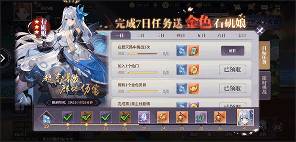 3、新手任务:完成7日任务即可获得石矶娘。每日对应的任务务必完成,这个英雄实力强劲,若不获取就太亏了。