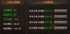 完成任务后可以提高VIP等级,带来VIP等级特权,VIP等级越高,特权带来的额外属性增加就越多。主要有打怪爆率、回收比例、切割伤害、攻击、防御。