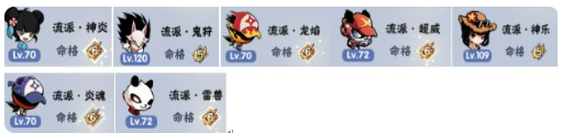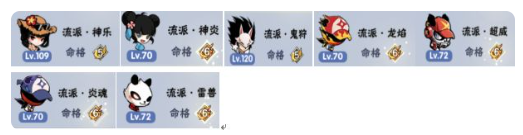 神乐琳(竞技场、33跑图、团本常用人物,且可以配合流派给队友加攻击)≈神炎小椒(贴脸二档伤害喜人,六命后团本宝箱必备,可配合流派给自己加攻击或减伤)≈鬼狩苍牙(三段跳好用,欢乐卡血怒且能切流派卡无敌)>龙焰小黑≈超威阿力>炎魂小黑>雷兽阿力