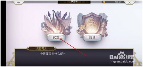 请挑选您想要购置的装备类别,在此点击左边的【武器】选项。