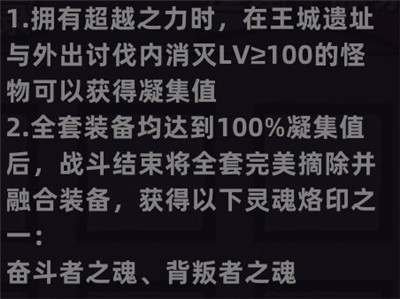 噬魂套装需集齐并穿戴五件方可生效,当这五件装备的凝集值均达到100%时,噬魂套装会消失,随后随机转变为一种噬魂buff。
