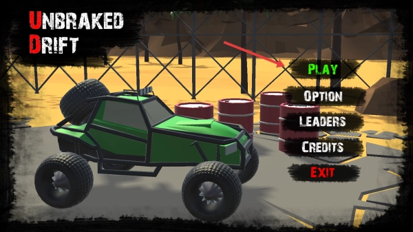 1、在主界面点击【PLAY】按钮,选择绿色越野车,进入《UNBRAKED DRIFT》的沙漠赛道,开启无刹车漂移挑战;初始阶段需重点适应沙地行驶的惯性特点与游戏操控逻辑。