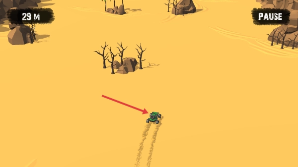 2、沙漠行驶时,避让枯树、石块等障碍,沿开阔沙路推进,左上角“29M”记录行驶距离,逐步熟悉车辆漂移手感,把控油门与转向节奏。