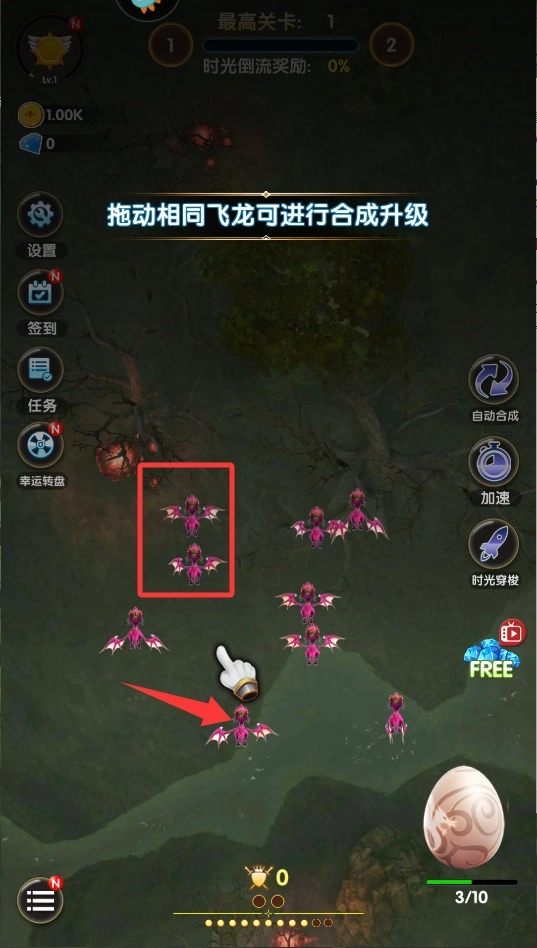 3、把相同等级的小龙往一块儿划拉,它们就会合成更厉害的大龙,战斗力直接翻倍提升。