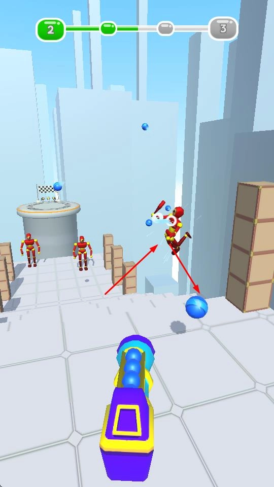 2、射击时,注意观察周围出现的其他红色机器人,灵活调整射击角度与目标,逐个将它们击败。