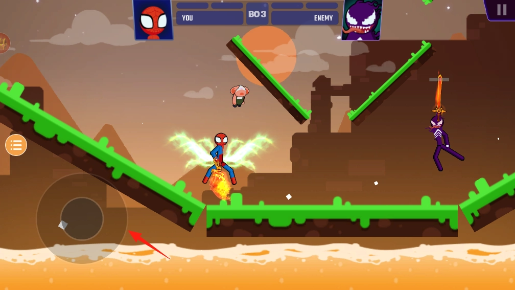 1、通过左侧摇杆操控蜘蛛侠火柴人造型,在草地与山坡场景中移动,跨越绿色斜坡这一障碍。