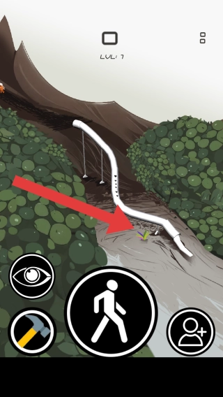 1、界面功能按钮及场景风格可识别,场景为野外山林,有管道、植被,红色箭头指向管道下方区域,是交互点或任务目标点。