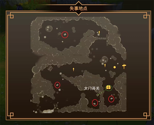 左下角的大门开启需操作地图上的×▲开关;左侧大门要使用银钥匙解锁;中间大门需放置齿轮石块才能打开;右边大门的开关位于中间大门后方哥布林聚集的区域;中间地穴的开启步骤为:先在大门内外都放置齿轮石块,接着依次移开大门上方的石块,再挪开地穴门口的石块,当中间大门关闭时,地穴大门便会随之打开。