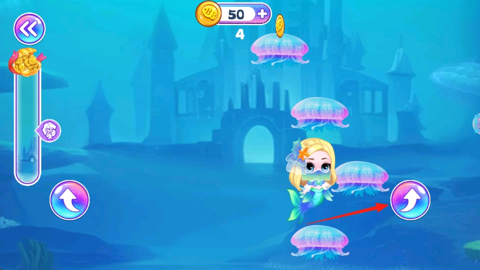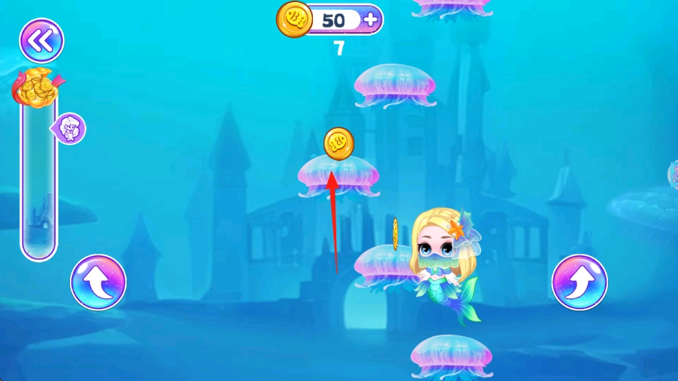 在水下时,要避开那种紫色透明的水母状生物,点击向上键右侧的按钮进行跳跃,收集黄色圆形的金币。