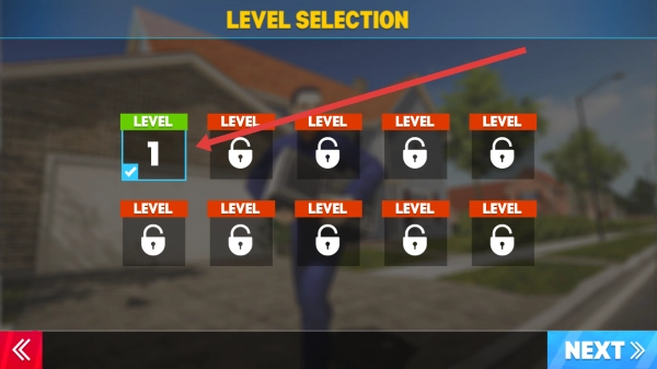 2、在关卡选择界面处,按照箭头指引方向通过点击LEVEL-1,开始游戏的第一关挑战。