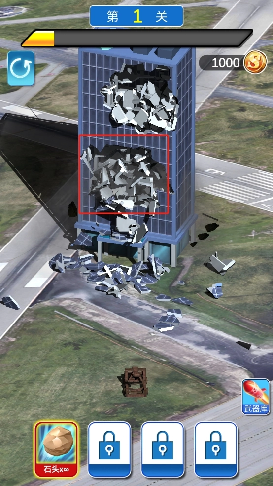 2、持续投放石头,借助道具冲击力,逐层摧毁建筑结构,观察碎片掉落情况,直至达成破坏目标。
