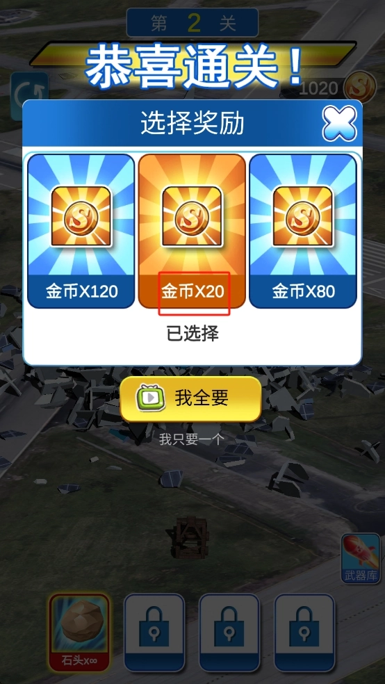 3、完成当前区域的破坏任务后,会进入奖励选择界面,你可以直接选择金币×20,也可以点击“我全要”按钮观看广告来获取所有奖励。