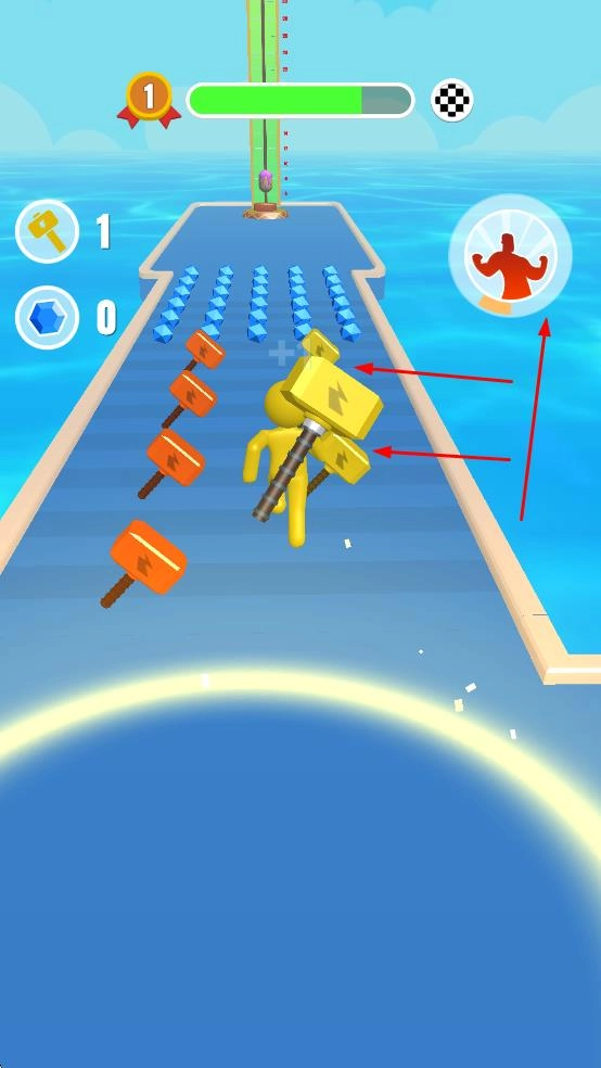 1、操控角色在跑道上移动,收集和自己颜色一致的锤子,提升锤子的数量,以此增强自身的实力。