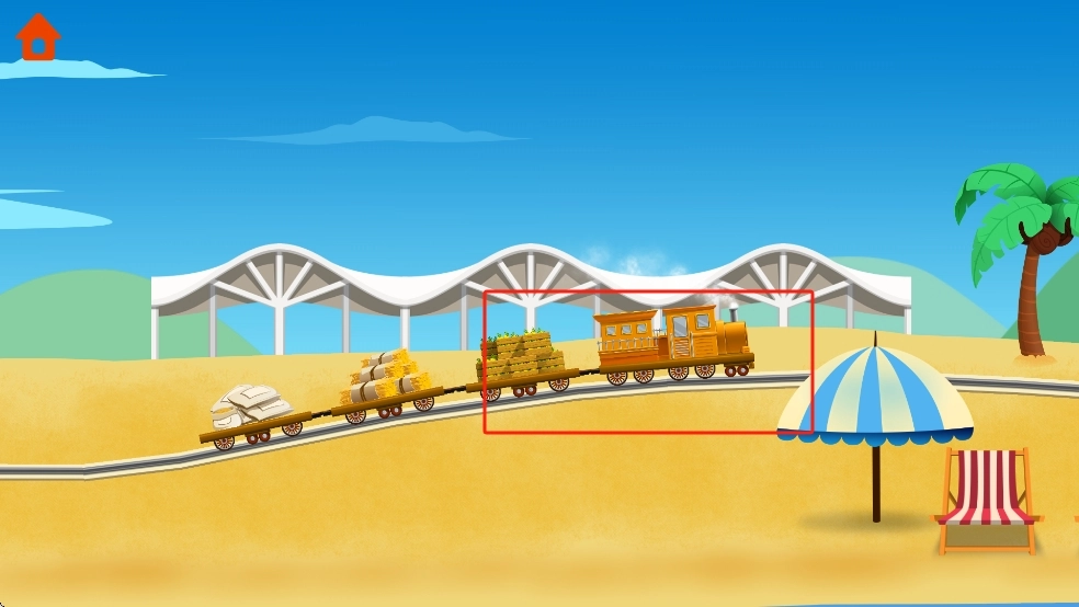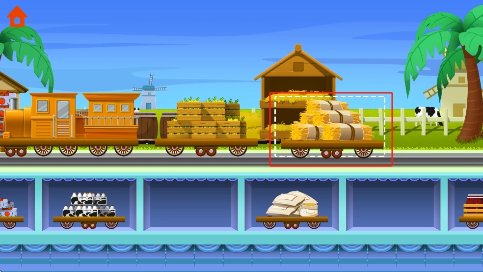 1、游戏开始时,我们先查看上层列车车厢内的货物,然后对照下层仓库货架上的物品,找到与之匹配的货物车,将其拖拽到列车对应的空位上,直至把车厢装满。