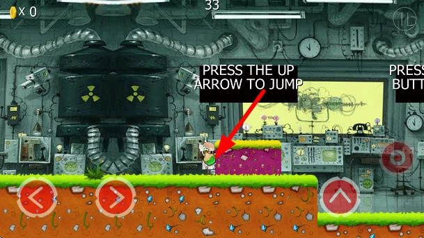 3、遇到紫色高台,点击上箭头按键让角色跳跃,跨越障碍,继续前行,收集金币道具,注意操作节奏与场景机关。