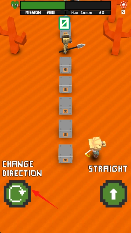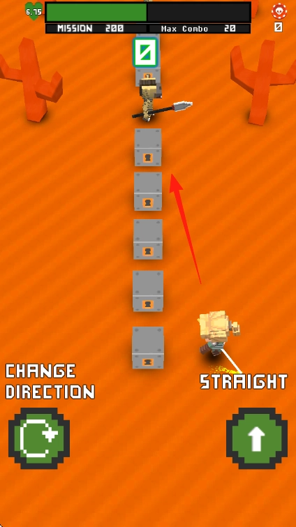 1、操控角色持武器小人,在橙色场景前进,遇到敌人,可按CHANGEDIRECTION改变方向或STRAIGHT直行按钮调整移动。