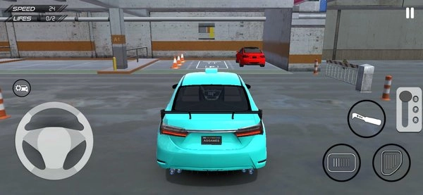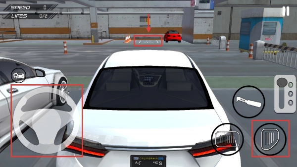 2、在停车场景,我们用左侧虚拟方向盘控方向,右侧按键控制油门、刹车,按指引把车停进目标车位,避开障碍哦。