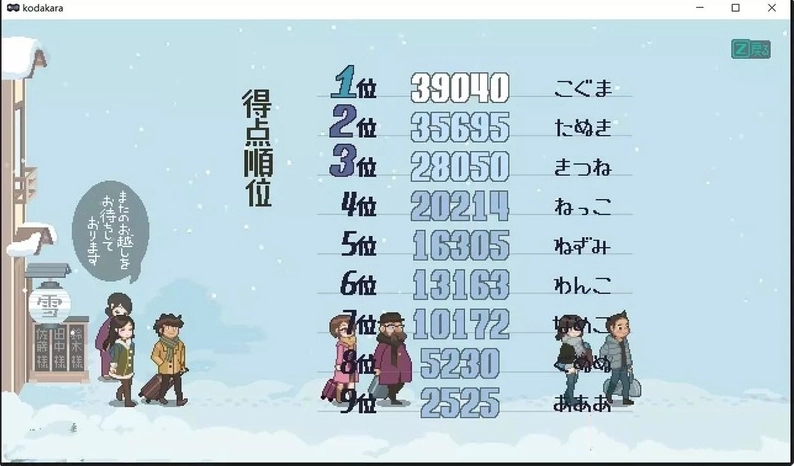 在游戏中获取分数的方式多种多样,像操控角色去【购买饮料】、指挥子宝神【吞食雪花】,亦或是在【搜寻卡片】与【泡温泉】的过程中都能积累分数;若想拿到高分,还得依靠玩家自身对游戏的认知以及和子宝神操作的默契配合。