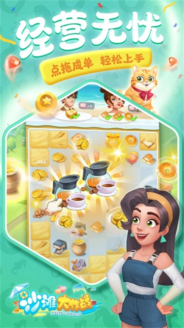 《沙滩大作战》是一款自由度极高的模拟经营与消除结合的游戏,玩家需完成更多合成消除任务,从而获取更多游戏道具和各类不同的菜谱。