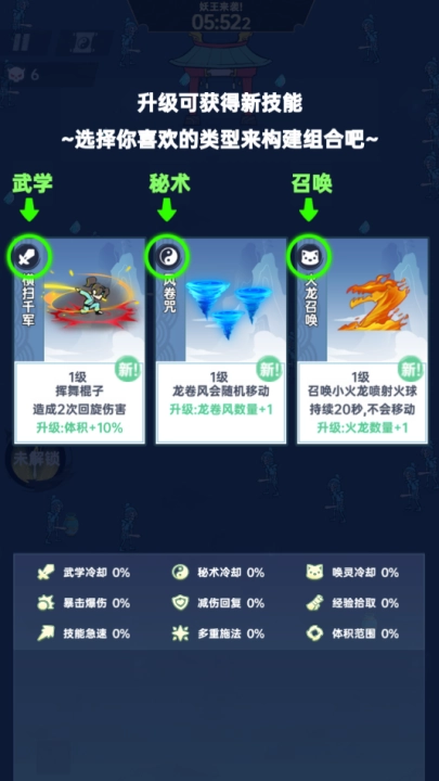 3、战斗前可选择学习心法,每种心法都具备独特加成,助力你完成更多割草生存挑战。