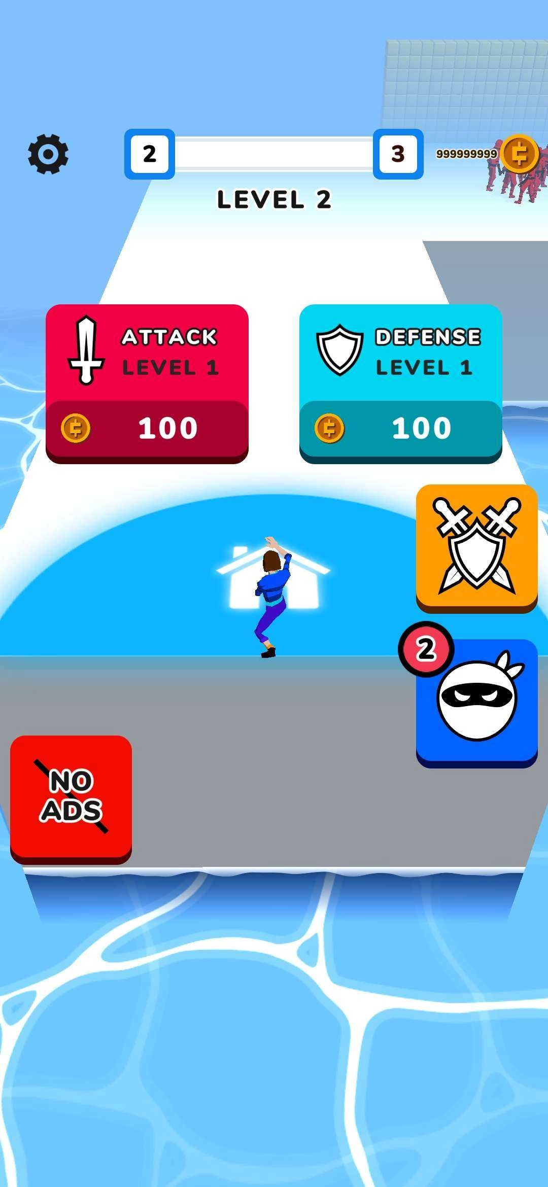 再聊聊难度设定:这次男主不会再掉悬崖了,但敌人的攻击依旧很痛。不过好在能用金币升级攻防,10关后还能解锁武器,玩法上比之前丰富不少。得提醒一下,如果没升级防御,遇上远程扔飞镖的敌人,通常撑不过两下,越到后面甚至可能被一下秒杀。像我这种全点攻击的玩家,就得格外考验走位技巧了。好在一开始操作不太习惯,后面慢慢熟练后,基本都能有惊无险地通关。