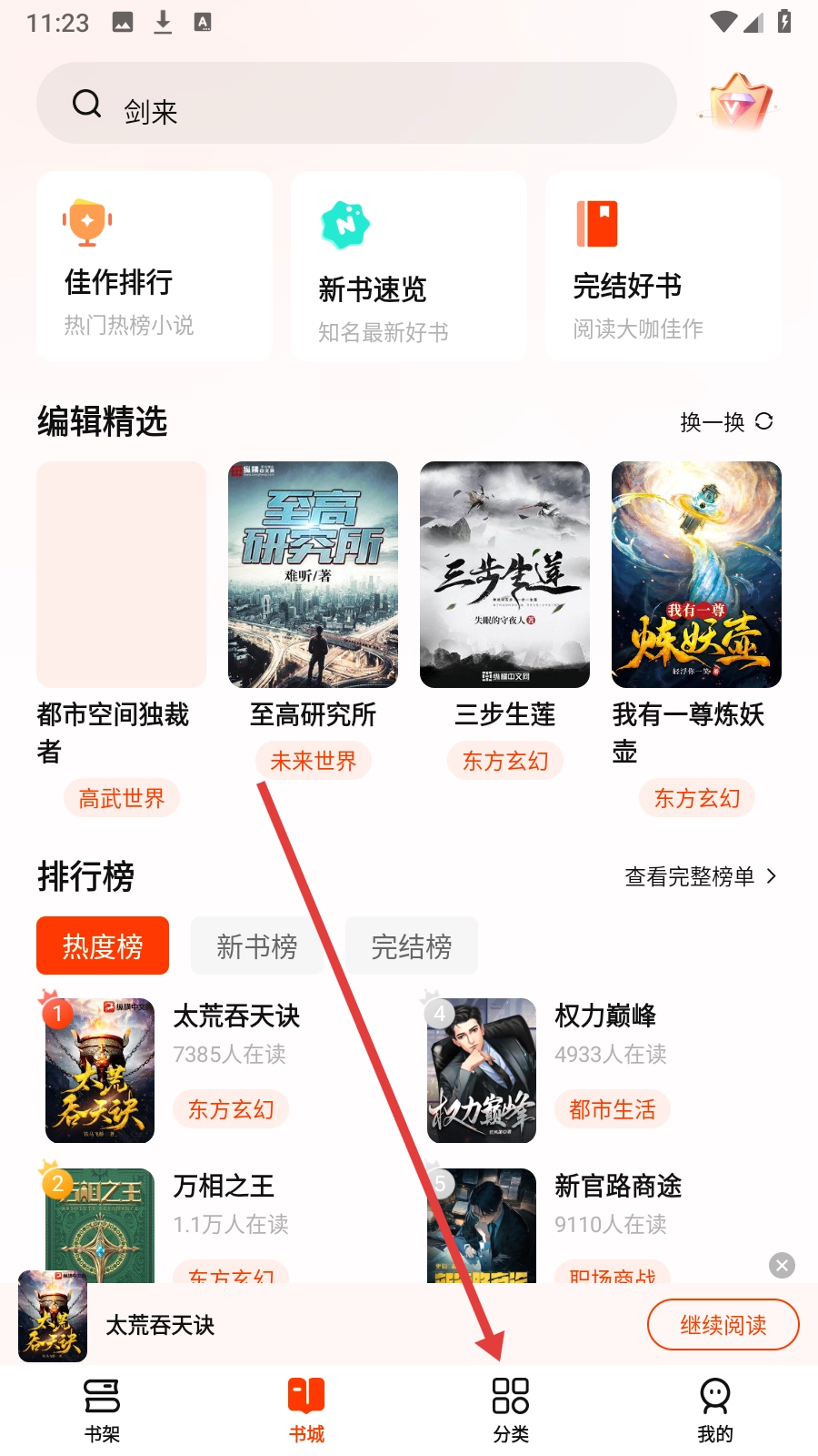 1、书城页点击【分类】,进入书籍分类界面。