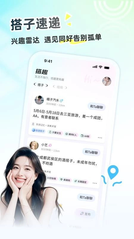 整合大量网友资源,涵盖各类兴趣爱好,能够满足不同用户组局寻搭子的需要。