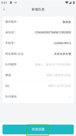 5、输入队员的姓名和身份证号等信息,点击【完成创建】,就可以完成队员的添加。
