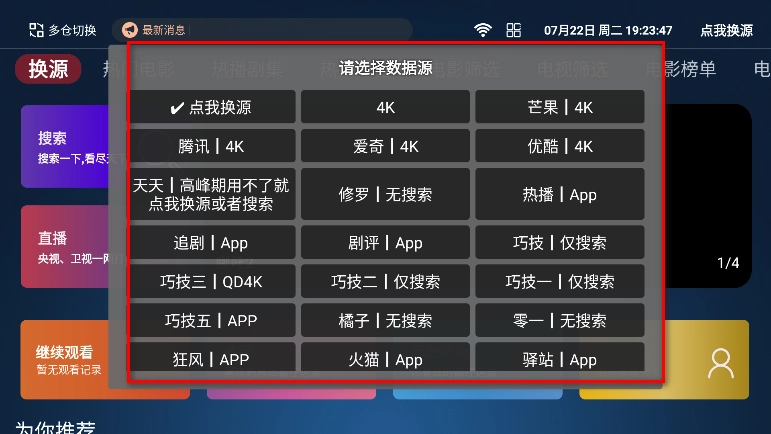 1. 第一步,下载并安装最新版本的4k影视盒子,接着点击左上角的换源选项。