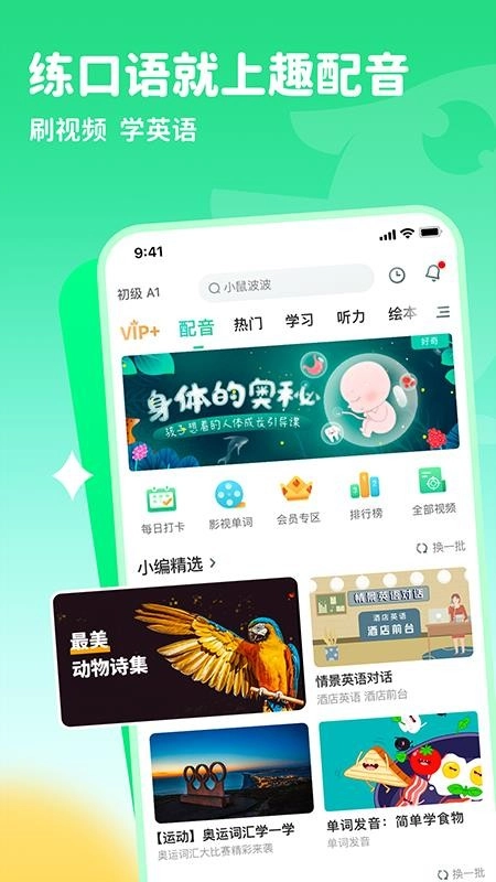 趣配音app官方版,专为英语学习者打造,提供英语配音学习服务。软件内海量影视片段,用户能随时通过配音练习英语口语。其充满趣味的英语配音学习功能,可激发用户英语学习兴趣,助力他们更轻松、高效地学英语,营造出轻松愉悦的英语学习环境。它以情景对话模式实现实时沟通交流,训练用户的英语口语,助其快速提升口语水平。此外,用户还能在此练习英语听力,针对听力和口语进行专项提升训练,使听力、口语得到全方位提升。不仅如此,软件支持用户定制英语学习计划,让学习更科学。有需求的用户,快来下载趣配音免费版体验吧!