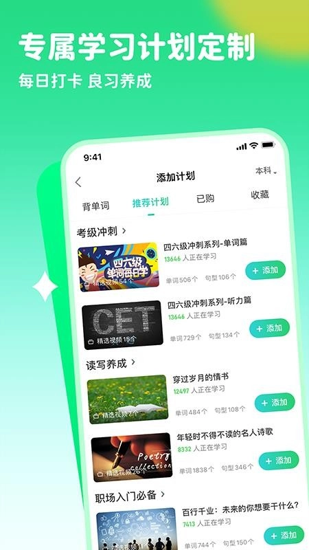 这里推荐了众多学习计划,用户能够挑选适合自身的学习计划并添加,随后依据该计划来学习英语。