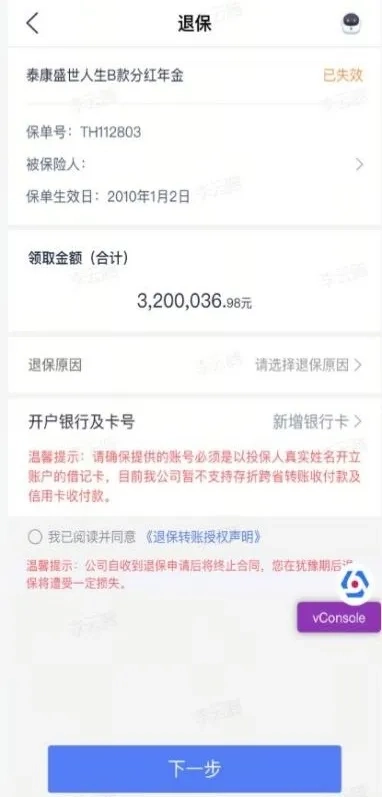 请选择退保原因,同时添加收款银行账户信息,完成后点击进入“下一步” 。