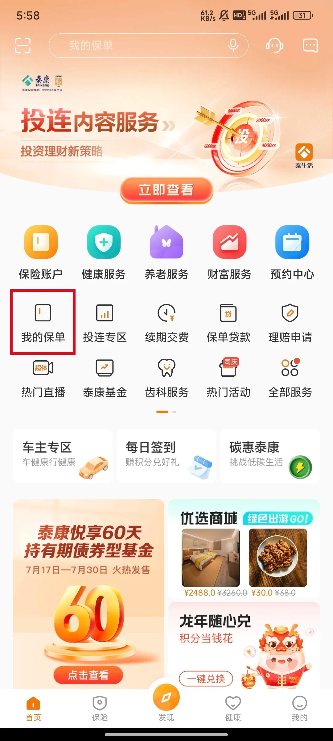 在泰生活的首页界面,找到并点击“我的保单”选项。