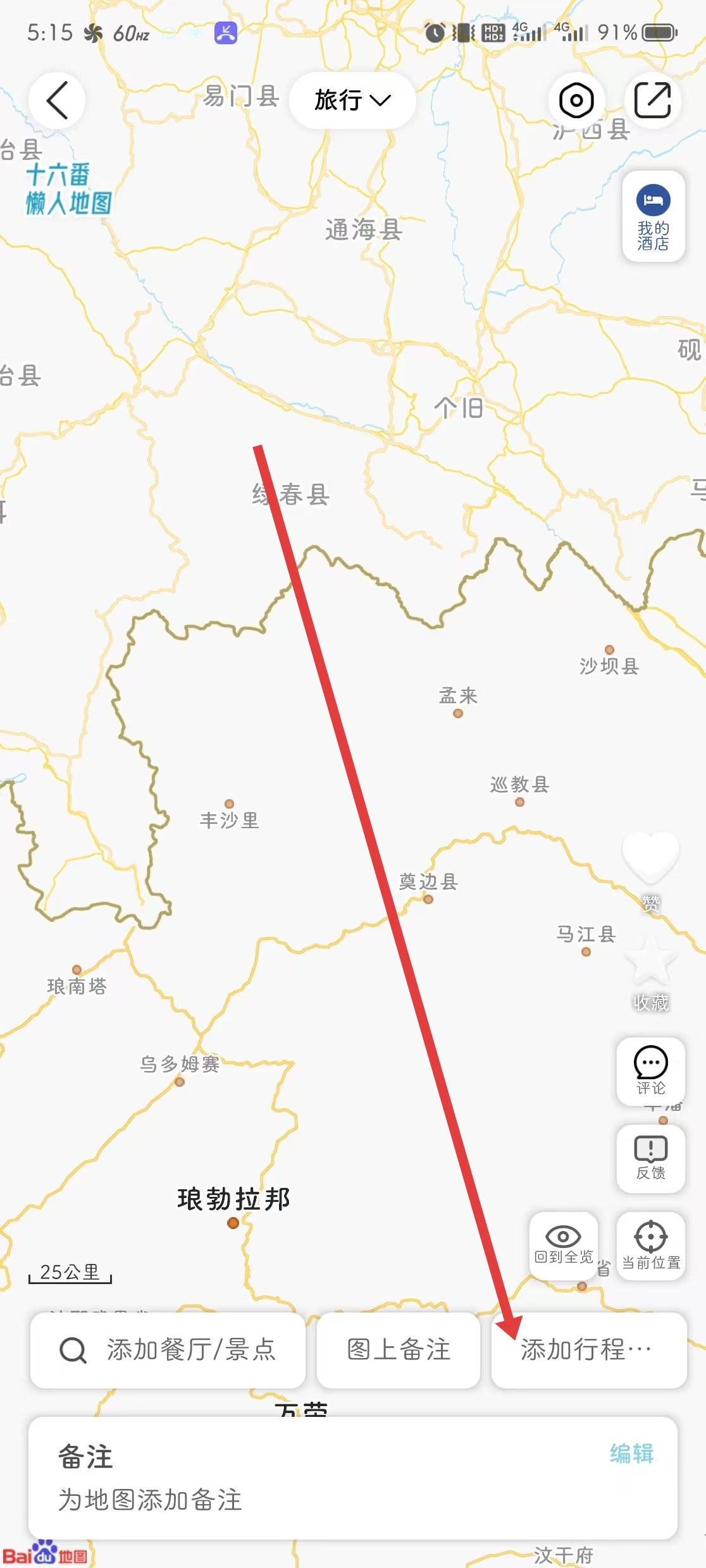3、进入地图编辑界面,点击底部添加行程选项,录入景点、餐厅等行程内容,生成专属图。