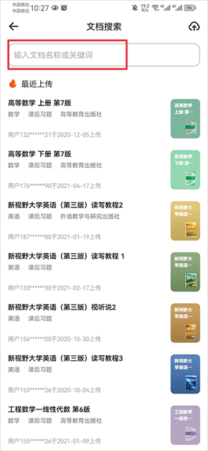 4、文档搜索:在搜索框中输入文档名称和关键词进行搜索,搜索完成后就可以在课本文档中查看课本中的课后习题答案啦