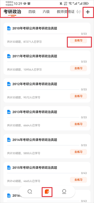 6、除了答案搜索功能,你还能在线做考研政治、四级、六级等真题。要是页面上没有你所需的真题,点击右上角的“+”号,即可添加训练目标。
