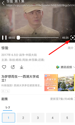 2、紧接着在视频播放页面里等待缓存,等到可以正常播放的时候,点击播放页面右下角的全屏按钮(如下所示)。