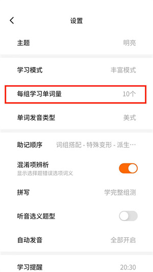 第三步。进入设置界面,选择“每组学习单词量”选项。