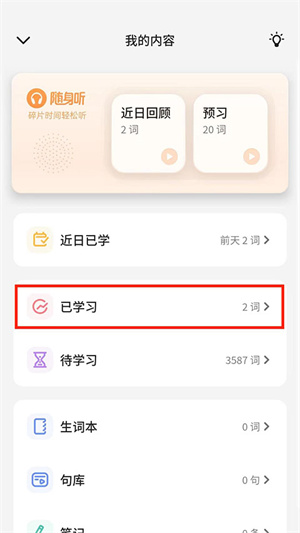 5、出现“还没有进入复习的单词”,这样数据清除完成可以重新背了。