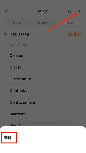 3、进入到已学习界面,选择右上方“三个点”按钮,选择“编辑”,
