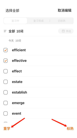 4、将下方单词进行勾选,选择“重学”或者“标熟”