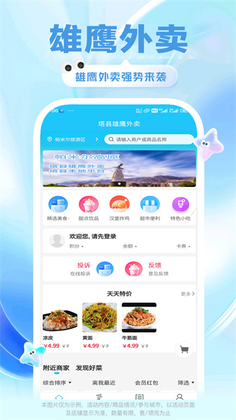 雄鹰外卖,作为一款融合便捷与丰富特性的本地外卖服务软件,网罗众多特色美食商家。借助它,您能轻松开启探索美食新世界的旅程,实时知悉每个店铺的最新优惠资讯,清楚了解具体折扣情况。如此一来,您在尽情享受美食的同时,还能收获实惠的价格。