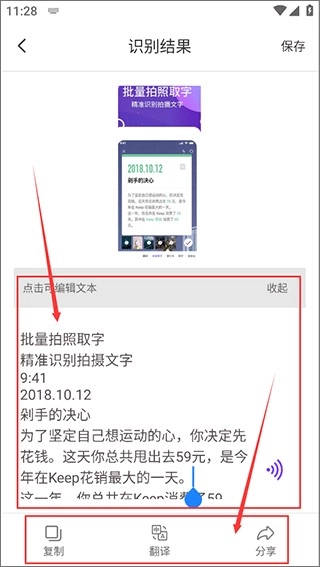 5. 在识别结果页面,您既能对照图片编辑文本,也能够一键进行复制、翻译、分享操作,还可以把文本保存下来。