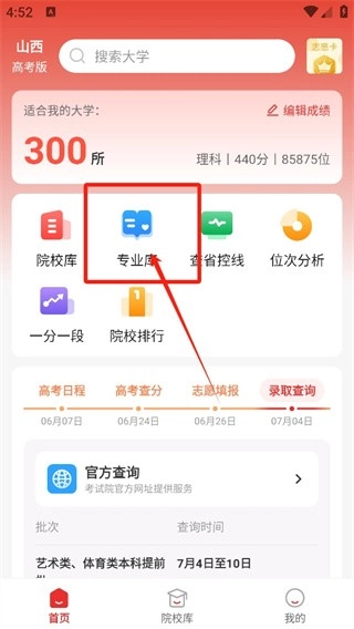 1. 在本站下载安装高考易志愿,安装完成打开进入主页,随后点击专业库功能。