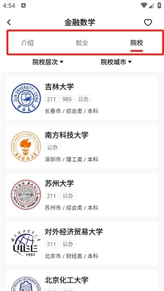 可以根据院校层次、院校城市、院校类型对各大院校进行筛选查找。