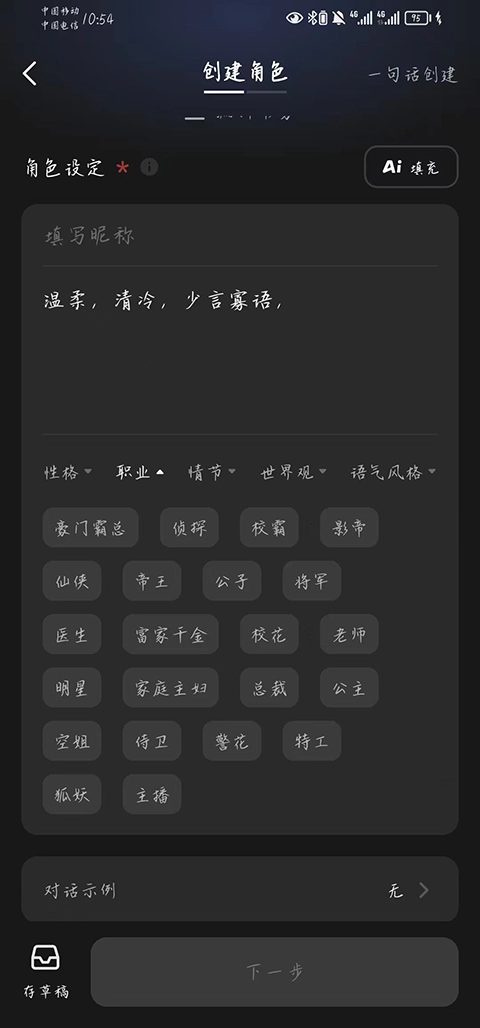 3、形象生成之后,填写角色昵称,进行角色设定,可以用一段话描写ta的性格、身份、说话风格、与你的关系等,也可以根据给出的设定设置性格、职业、希望与你开展的剧情类型等。