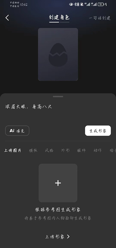 2、第一步创建角色的外形,在描述框内尽可能详细地描绘你的角色,需注意避免输入情节及故事相关描述,也能选用设定模板。上传你觉得符合该角色外形的图片,完成上述操作后点击生成形象。