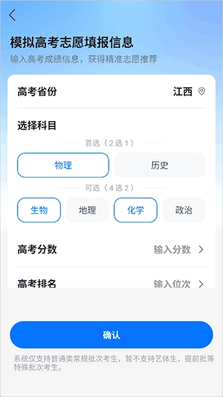 1、打开进入后选择省份、科目、高考分数等信息